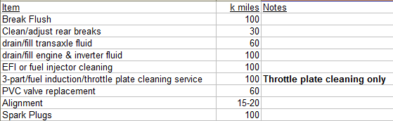 Denso says the Iridium plugs are good for 120K miles in conventional cars (engine is always on). Toyota has a 120K mile change interval for non-CARB states. CARB sates have a 150K mile change interval; makes sense considering the Prius engine is not always on. I changed mine at 121K miles and the plugs looked really good still; missed the foot note in the book about the 150K mile spark plug change interval for CARB states. Coolant (Engine & Inverter) is 100K miles for initial, then every 50K miles, according to maintenance manual. Throttle Plate cleaning every 100K miles is too long. Consider checking the air filter and throttle plate at the same time an oil change is done. Fast and easy to check both. Fast to replace air filter if needed and just slightly longer to clean off the throttle plate/body if needed. Consider getting a lifetime alignment from Firestone Tire or who ever else still offers a lifetime alignment purchase option. Cost me $120 back in 2011. I just drop the car off once a year and don't pay a dime.