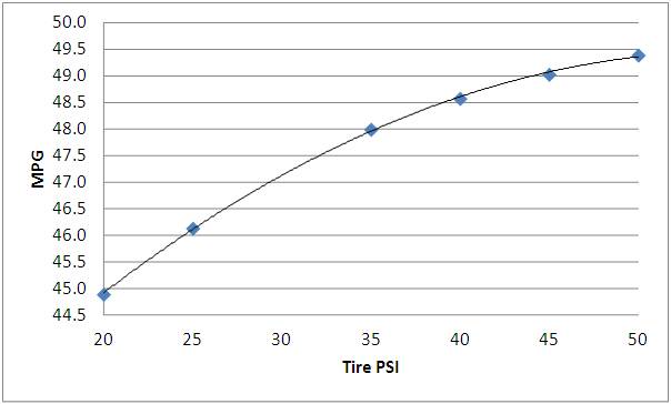 Re: N2 - Yes if tires filled with air (78% N2), over the years your %N2 will climb possibly to about 90% N2. So that's part of the reason why its hard to make a stronger recommendation for N2 in car tires. I like Costco approach of putting N2 in new car tires....but I'd just refill with regular air after that. Re: Effect of Tire Pressure- I have previously shown this chart (below), based on some equations, but I did not have actual Prius MPG data so it's the shape of the plot that's important. As you go to too low pressures, the MPG decrease worsens. FuelEconomy.gov say impacts is: "You can improve your gas mileage by up to 3.3% by keeping your tires inflated to the proper pressure. Under-inflated tires can lower gas mileage by 0.3% for every 1 psi drop in pressure of all four tires." But other sources say the effect much larger than EPA says it is...so I do not know. I've noticed with my Gen2 sometimes I am getting 50 MPG on the display, then stop to get gas... then it won't go over 45 MPG on the display. I tend to feel real MPG is best calc'ed via hand at fill-up. But then we have (in Gen2) that flexible guess tank so we have a hard time with these sorts of measurements. Here's some MPG data from Edmunds: