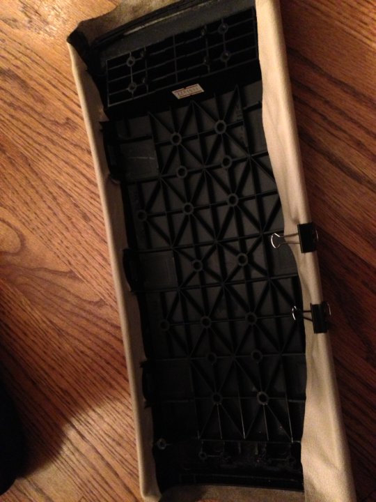 I cut my leather to match the original fabric, then I stretched it out over the console cover, using clips to hold it on while I pulled it tighter. I let it sit like this overnight, to try to stretch out any wrinkles in the leather. Then came the arduous task of trimming edges and gluing down the ends. This just took a lot of patience. I would brush on some cement, let it dry a bit, and then stretch the leather out and lay it over the glue. That cement is unforgiving, you stick it down and that's it, no moving it around, so make sure you get it right the first time.