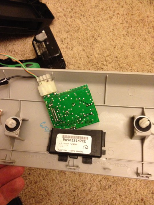 Ok...this job is not for the faint of heart!! I am no master tech but I sling a wrench pretty well! The pics below show my finished product as well as the view from behind. The last pic shows the two clips that hold it together which I have something to say about! First...in order to do this clean and correctly you will need to locate the module that has the two separate boards. There is a ribbon that connects the two but it allows you to move the larger board so that this cover can be put back into place. (thanks to Genetiix for pointing that out!) The next thing is that you need to modify the housing so that the bottom 2/3's of it is removed. This is so the lower board is completely exposed and you can move it around. The reason why you need the top 1/3 of the housing is because this helps the controller part of the module to sit put and allow the two clips from the cover to snap in and hold it all together. Now this is where I have a major problem with this mod! These have been designed to work in sunvisors. The only thing between the cover plate and the module is fabric!!! If you you have any sort of thickness in your mounting location....good luck securing it and making it work properly. I had to place the thing on the floor and use linesman pliers to evenly distribute all of my 200lbs on both sides of the clip just to get it to catch and snap together. Problem is that it is so tight that I am afraid they are just going to fall apart one day and land on my lap while I am driving! I will have to figure out something when that time comes. Now just because the set up looks assembled doesn't mean it works! The rubber buttons on the face don't actually reach far enough to hit the buttons internally. I had trimmed little pieces of plastic from the scrap part of the housing and hot glued them to the tips of the rubber internally. That did the trick. (thanks again Genetiix for the idea!) Now if anyone has any ideas on how to improve on what I have already done....please chime in!! Oh...you have to trim the plastic lines on the back of the cover in order to get the housing to sit flush. And also...I didn't use a dremel or anything. I drilled all of the holes so they line up perfectly and allows for a cleaner OEM look install