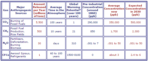Excellent table, good information! Yes, a single CO2 molecule is a less powerful GHG than the others. However, due to its concentration CO2 is responsible for about 60% of the greenhouse effect that makes life comfortable on this planet. From the article the graph you shared came from: Another point, your graph showed a concentration of 350,000 ppb. That number is now about 400,000 ppb.