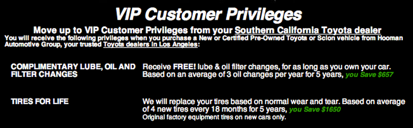 They seem pretty loosey-goosey with their "averages." Three oil changes/year? I don't think too many of us drive 30,000+ miles/year. Four new tires every 18 months? I suppose so, if you need three oil changes/year. But look at all of the money you saved!!! Hoo man, what a dealership!