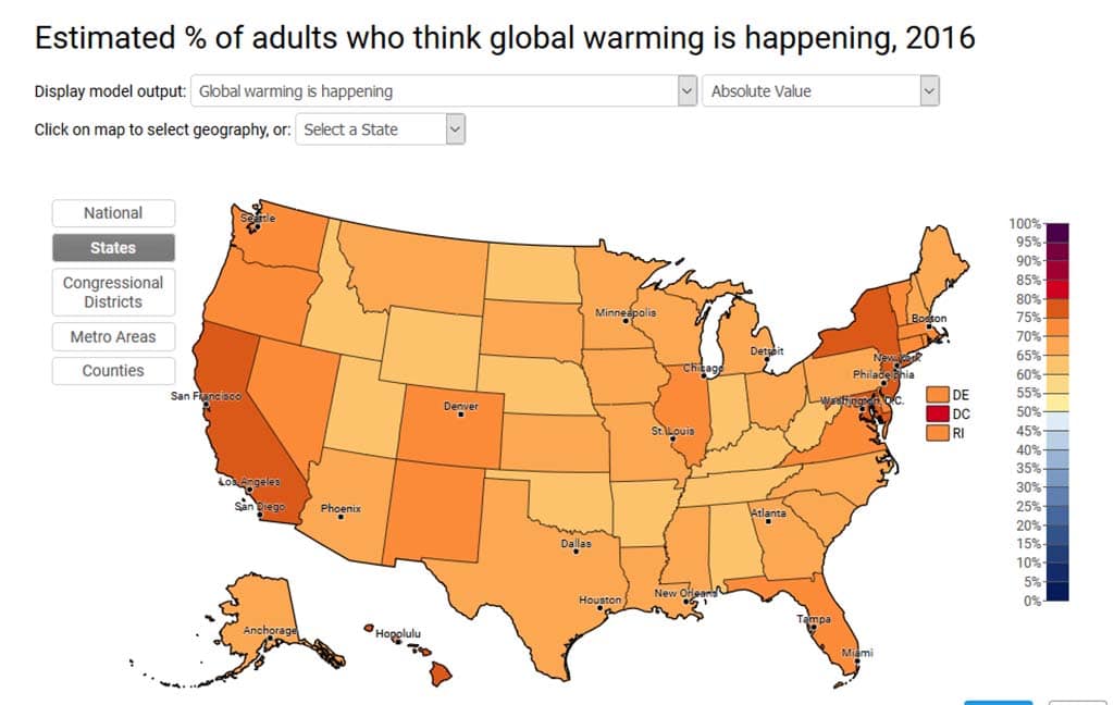 I had been wondering if there might be a "President Trump vs Secretary Clinton / Likelihood of Buying Green Cars" correlation sort of thing going on from sea to ever-rising sea, but I didn't want to be the first (here) to suggest the possibility, whether WITH or withOUT any form of evidence. PS: Odd... according to the map / info above, a majority of adults in EVERY state "believes global warming is happening"....