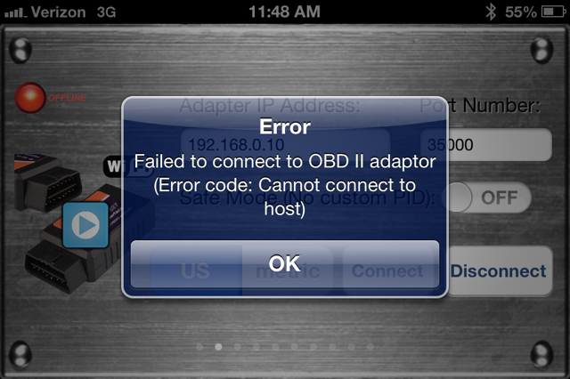 Hey there! I recently purchased an ELM 327 OBDII WIFI device and the EngineLink app via iTunes Store. Just to clarify what tech I am using, I have an iPhone 4s and 2012 Toyota Prius. I turn my car to the "on" position, just before the engine starts and I plugged in the device and configured the IP address and subnet mask on my iPhone with the IP address and port number within the EngineLink app. However, once I push "connect" this error message pops up and I am not able to do what I wanted to do... "Failed to connect to OBD II adapter (Error code: cannot connect to host)"----see image Just to give you an idea of what I am trying to accomplish: Disabling the ever-annoying reverse beep, and replacing it with one beep. I would really appreciate some feedback or advice! Thank you, Christian A.