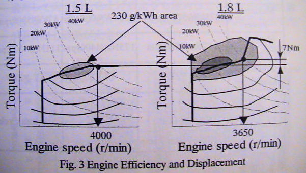 The regular Prius is geared so gas engine revs lower due to higher torque from 1.8L engine. The engine also has wider range of sweet efficient spot. See the BSFC where c should be similar to Gen2's 1.5L.