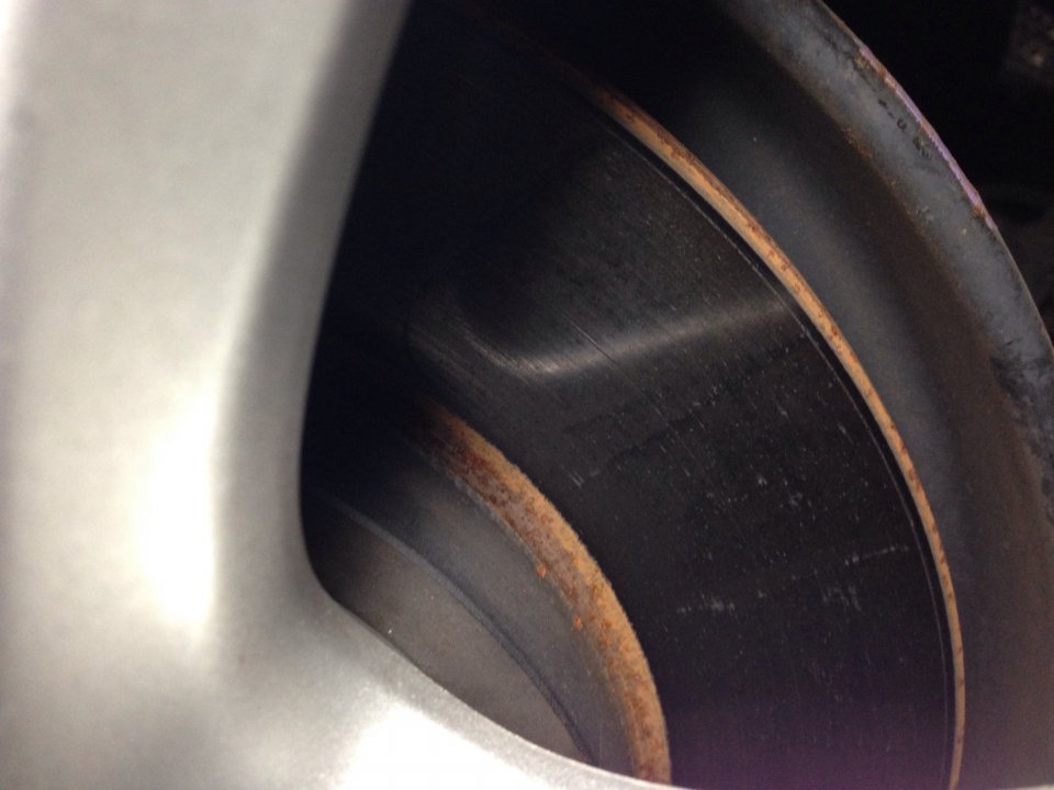 Has anyone worked on your rear brakes? There's a pin on the back of the inside pad, that has to be in between the raised spokes on the caliper piston. If it mis-aligns, rides up onto the spoke, it'll cause the pad to press more on the outer edge (where the pin is), less or none on the inside edge. A few things you can do for quick check, in order from simplest to more involved: 1. After an extended drive immediately feel the rear wheels, how warm they are. Then reach through the spokes and feel the disk itself. Compare sides, and front to back. If one or both rear disks are markedly warmer there could be an issue. 2. Crawl under the rear (there's enough room without raising) with a strong light, and check the inside face of the rear disks. There's a slim gap between the dust cover and caliper, just enough to see the inside face condition. If there's a misalignment of that pin, you'll likely see a rusty, unused zone, towards center of the rotor. 3. Raise the rear end and the parking brake released try turning the wheels. There will be a slight amount of drag due to the nature of the parking brake mechanism's auto adjustment, but it shouldn't be tough to turn the wheel. If there's real drag, they're hard to turn, there's an issue. A few pics, #4 shows rusty zone on rotor, what misaligned pin can do: (excuse the mis-rotation, IPhone jpeg format messing everything up) #1, outer face of rotor, pretty scored: #2, outer pad, kinda pitted: #3, inner pad, note unused zone: #4, inner face of rotor, note rusty (unused) zone: #5, Piston face: #6, chewed up pin: