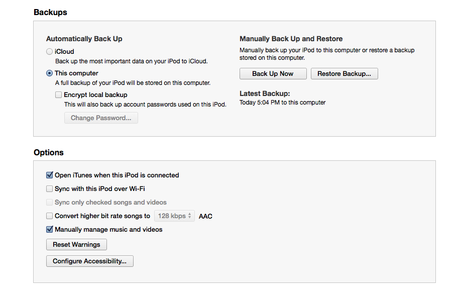 Hey, it seems to work! Thanks a million!!! I asked this question on the Apple forums, where I often get answers to my OS X and iOS questions, but your post is the first to provide a real solution. If I disable syncing, then I cannot manage my podcasts, which is the reason I plug the thing in every couple of days. I just wanted to disable backups. Now that I have the iPad, I don't put anything on the iPod that requires backing up. I just use it for music and podcasts and occasionally the timer or stopwatch. The iPad needs backing up, but I never really need to plug it in to the computer, so it wouldn't get backed up automatically. I'll just have to plug it in for the occasional backup. So anyway, thanks for the info. The iPod syncing is a lot faster without the backing up.