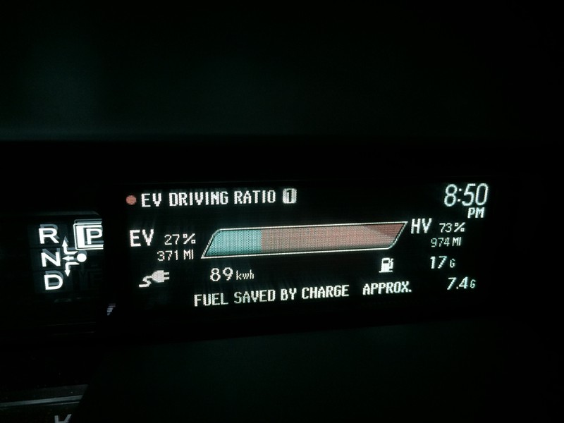 You went 371 EV miles with 89 kWh of electricity. If we add 15% for charging loss (89/0.85), you used 104.7 kWh from the wall. Since 33.7 kWh is equivalent to a gallon, this is 3.11 gallons (104.7/33.7). 371 miles / 3.11 gallons is 119 MPGe. Gas is easier. 974 HV miles / 17.5 gallons is 56 MPG. We add 0.5 gallon because Prius displays in integer without rounding. 17.9 would display as 17.