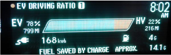 I was pushing the envelope a little today (Wednesday). When I got home I was out of EV range, 0 miles of gas left.