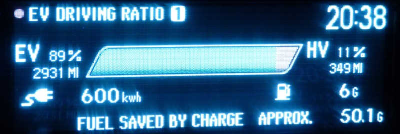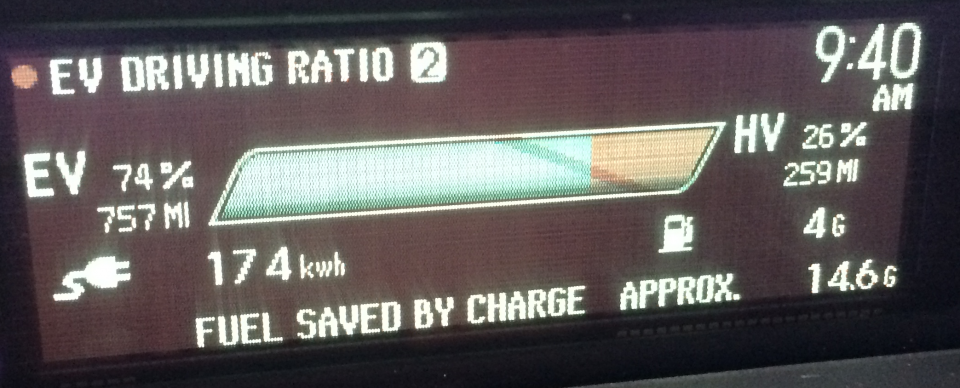 The rules for this contest result in far more inaccuracy than the PIP's computers are capable of by using only the ratio display. The gallons used as shown on this display are terribly imprecise and the formula used attempts to correct this by adding 0.5 gallon. I've been observing the ratio display and from my observations it always under reports the fuel used, the under reporting ranges up to a full gallon. Using one of the trip odometers and it's MPG calculation allows a much more precise fuel used estimate. To illustrate the issue I have reset my ratio and trip B at my last fuel up. My current ratio screen shows 53 EV miles, 57HV miles, 12 KW, ZERO gallons while the trip B shows 111 miles @ 135 MPG. using trip B data suggests I've used 0.822 gallons of gas. What the results show is the obvious fact that EV miles are more efficient than HV miles and those who drive slowest get better efficiency. If we included the data from a trip screen which shows average speed and allows much greater gas used accuracy and calculated HV MPG as well the rankings would change dramatically. FWIW using both trip and ratio, my average speed on trip B is 38 mph yet my HV mileage is 69.3MPG and my EV is 126 MPGE with an overall of 89MPGE Even taking the efficiency hit that hilly Kentucky gives I'm really impressed with my PIP!