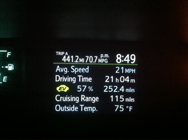 I made it 500 miles on a single tank... w-w-wub-wub == Pictures: Proof of fuel economy and distance Overall trip statistics I had to go on a road trip, and after I saw that I maintained a high enough fuel economy, I figured, hey, might as well try for the 500 mile tank. I did it all over the course of 4 consecutive days. Techniques discussed below. Tires: Bridgestone stock 15", tire pressure in the front is 41, tire pressure in the back is 38.5. (41.0/38.5) Fuel: Octane 91 - no ethanol (E0) Temperature: avg. 70 degrees F, range from 64-77 degrees F I filled up at the same gas station before and after the 500 mile run. I didn't reset Trip A until I was already a few miles down the highway and then I thought of it. Hills: I let off on the gas a bit a few seconds before cresting a hill, so that I could keep my green arc just above halfway on the downhill but still not go faster than 55 mph downhill (faster means more drag). == Day 1: Highway, 110 miles, both ways (62.4/60.3 mpg), at 53 mph. Music blasting, light AC, 70 degrees, ECO on. I drove at night on the way back. Day 2: No commute. Day 3: Went on a long lazy backroad, 40 miles both ways, around 49 mph. Mean fuel economy 68 mpg. Day 4 (today): Same as Day 3, but slightly shorter, and really windy (25+ mph diagonal gusts), and I went back and forth 3 times each. Mean fuel economy 66 mpg. ==== And just for fun: My odometer reading: I still don't even have 3000 miles on the car yet Also Trip B: Trip B is my lifetime fuel economy. I reset the day that I first got my car and as soon as I parked it at home. Since I've had my car, my lifetime fuel economy is 60 mpg. I do mostly short trips (like 1 mile) so I have a ton of time on electric: