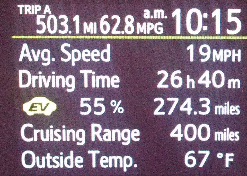 Here's my entry- 500.7 miles of commuting on the NYS Thruway and Rt.17. 60-62mph with cruise on, I do click it off for downhills so I can stealth with my foot, the CC does not seem to know how to do this. Lots of my version of pulse and glide on 2-lane backroads, and a 5 mile round trip every day into town, mainly trying to maximize EV mode. I do have the one upper grill slat blocked with foam pipe wrap, and run 42-44 psi. No ridge riding, no drafting. Pics taken this morning at the Getty station on Middletown road, Nanuet NY on my way in to work. 61.83mpg I love this car...