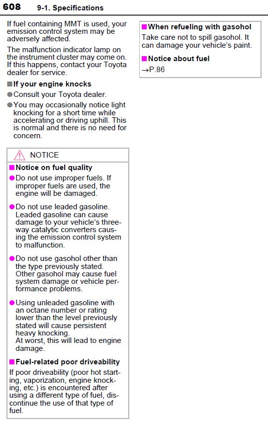 Below is what your 2023 Prius Prime Owners Manual says about fuel. Notice that it says to not use methanol, MMT, leaded gasoline, E30, E50, E85, or anything containing more than 15% ethanol, but it does not say anything against E0 or requiring any ethanol at all.