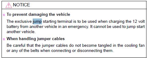It's the opposite, not? Pg 544. You can use the under hood connections to jump start the Prius but you should connect to the 12V battery directly if you're jump starting another vehicle. Also, that warning/suggestion is gone from the Gen 3 manual. In the Gen 2 manual, it recommends against jump starting another car.
